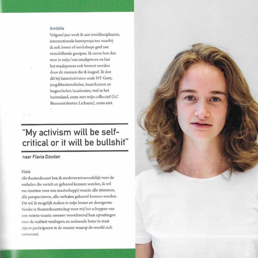 Ambition Next year I create interdisciplinary, intersectional art projects, and at the same time I give lessons and workshops with different and diverse groups. I let the lessons and the students change the artworks, and I let the artworks infect the lessons. I do this at theatre houses such as NTGent, theatreschools, community centres and public spaces, sometimes abroad, sometimes with my collectives.